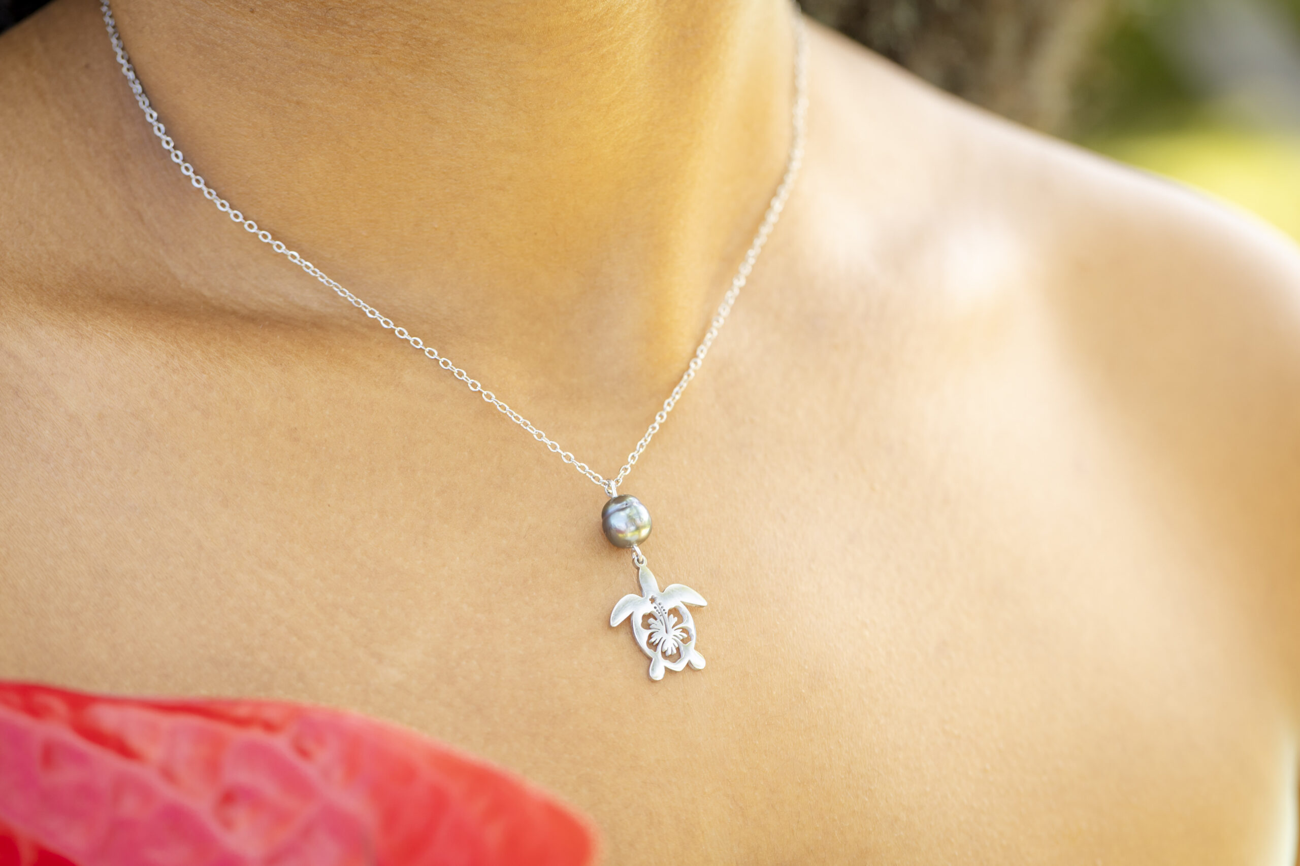 Collier argenté avec perle de Tahiti et pendentif tortue et son hibiscus
